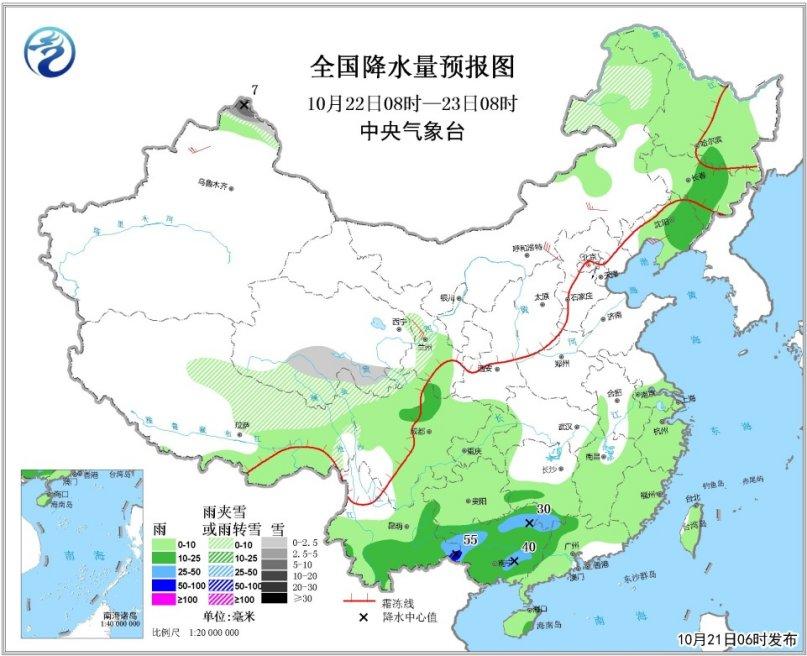 10月22日08時至23日08時,新疆阿勒泰地區(qū)、內(nèi)蒙古東北部、西藏東部、青海南部、甘肅中部、川西高原北部等地部分地區(qū)有小雪或雨夾雪,其中,阿勒泰北部局地有大雪(5~7毫米)。吉林東部、遼寧東部、云南東部、四川盆地西北部、廣西大部和廣東西部等地部分地區(qū)有中到大雨,其中,云南東南部和廣西西南部等地的局部地區(qū)有暴雨(50~55毫米)。新疆北部、甘肅中部、內(nèi)蒙古中東部和遼寧中部等地部分地區(qū)有4~6級風(fēng)(見圖2)。