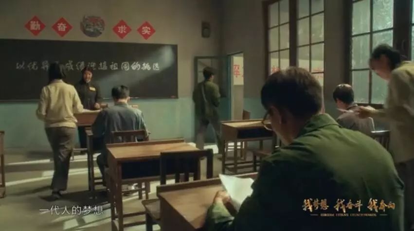 1978年高考恢復(fù),中國(guó)由此重新迎來(lái)了尊重知識(shí)、尊重人才的春天。坐在1978年正在進(jìn)行高考的教室里,考生劉燁寫(xiě)下自己作文的最后一句話(huà):“為祖國(guó)和人民不懈奮斗”。他在鏡頭前書(shū)寫(xiě)下“奮斗”二字,體現(xiàn)了那個(gè)年代的人渴望建設(shè)祖國(guó)的一腔熱血。