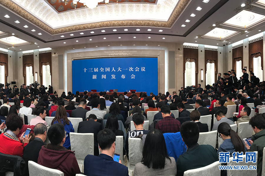 3月4日,十三屆全國(guó)人大一次會(huì)議在人民大會(huì)堂新聞發(fā)布廳舉行新聞發(fā)布會(huì),由大會(huì)發(fā)言人張業(yè)遂就大會(huì)議程和人大工作相關(guān)的問題回答中外記者的提問。圖為新聞發(fā)布會(huì)現(xiàn)場(chǎng)。新華網(wǎng)/中國(guó)政府網(wǎng) 陳杰 攝