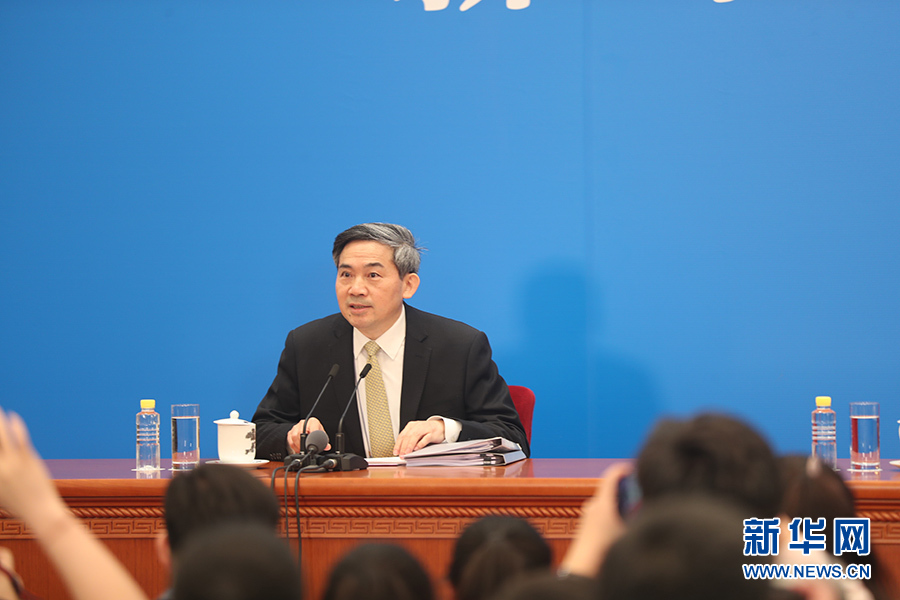 3月4日,十三屆全國(guó)人大一次會(huì)議在人民大會(huì)堂新聞發(fā)布廳舉行新聞發(fā)布會(huì),由大會(huì)發(fā)言人張業(yè)遂就大會(huì)議程和人大工作相關(guān)的問題回答中外記者的提問。圖為新聞發(fā)布會(huì)主持人何紹仁。新華網(wǎng)/中國(guó)政府網(wǎng) 陳杰 攝