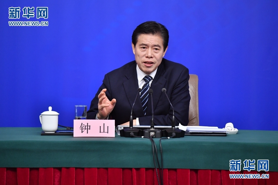 3月11日,十三屆全國(guó)人大一次會(huì)議新聞中心舉行記者會(huì),邀請(qǐng)商務(wù)部部長(zhǎng)鐘山、副部長(zhǎng)兼國(guó)際貿(mào)易談判副代表王受文、副部長(zhǎng)錢克明就“推動(dòng)形成全面開放新格局推動(dòng)商務(wù)事業(yè)高質(zhì)量發(fā)展”相關(guān)問題回答中外記者提問。這是鐘山在回答記者提問。 新華社記者 李鑫 攝