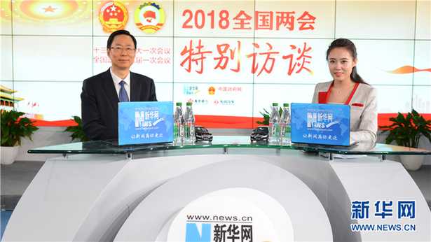 3月14日,全國(guó)人大代表、南京市市長(zhǎng)藍(lán)紹敏(左)做客新華網(wǎng)2018全國(guó)兩會(huì)特別訪談。新華網(wǎng) 楊濛攝