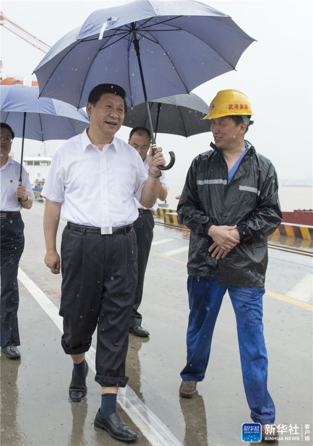 2013年7月21日上午,習(xí)近平冒雨來(lái)到武漢新港陽(yáng)邏集裝箱港區(qū)考察。新華社記者 李學(xué)仁 攝