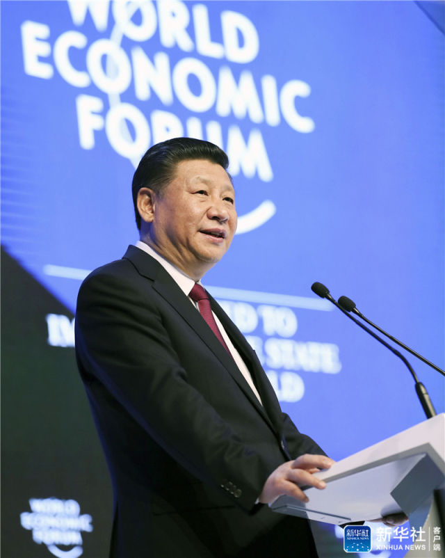 2017年1月17日,習(xí)近平在瑞士達(dá)沃斯國(guó)際會(huì)議中心出席世界經(jīng)濟(jì)論壇2017年年會(huì)開(kāi)幕式,并發(fā)表題為《共擔(dān)時(shí)代責(zé)任 共促全球發(fā)展》的主旨演講。新華社記者 蘭紅光 攝