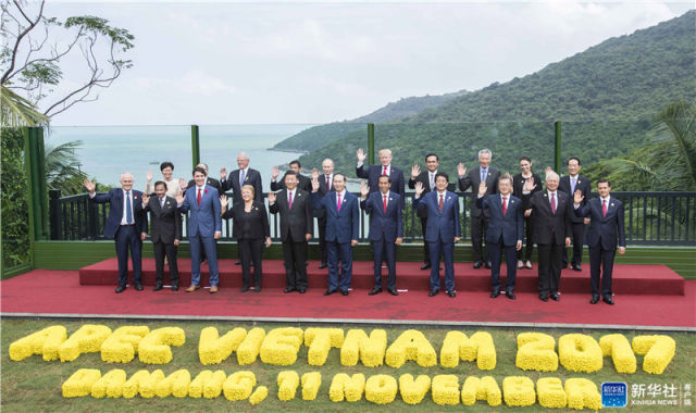 2017年11月11日,亞太經(jīng)合組織第二十五次領(lǐng)導(dǎo)人非正式會(huì)議在越南峴港舉行。習(xí)近平出席并發(fā)表題為《攜手譜寫(xiě)亞太合作共贏新篇章》的重要講話。這是會(huì)議期間,習(xí)近平同其他亞太經(jīng)合組織成員經(jīng)濟(jì)體領(lǐng)導(dǎo)人、代表合影。新華社記者 李濤 攝