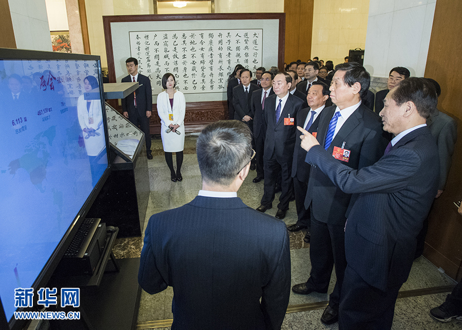 隨后,栗戰(zhàn)書走進(jìn)設(shè)在人民大會(huì)堂一樓大廳的新華社兩會(huì)新聞報(bào)道中心,仔細(xì)觀看了微視頻《誓言》、人工智能產(chǎn)品《“媒體大腦”帶你看憲法宣誓》、新華社兩會(huì)報(bào)道實(shí)時(shí)大數(shù)據(jù)展示、新華網(wǎng)“奮進(jìn)新時(shí)代 筑夢新征程”兩會(huì)融媒體專題等,看望正在這里緊張工作的采編和技術(shù)人員,與參加兩會(huì)報(bào)道的新華社外籍記者親切交談。在觀看了新華社制作的融媒體產(chǎn)品《“90后”全國人大代表程桔:小丫回村當(dāng)書記》后,栗戰(zhàn)書對新聞媒體創(chuàng)新兩會(huì)報(bào)道給予充分肯定。