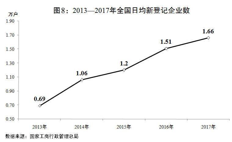 二是大眾創(chuàng)業(yè)萬(wàn)眾創(chuàng)新不斷深化?!秶?guó)務(wù)院關(guān)于強(qiáng)化實(shí)施創(chuàng)新驅(qū)動(dòng)發(fā)展戰(zhàn)略進(jìn)一步推進(jìn)大眾創(chuàng)業(yè)萬(wàn)眾創(chuàng)新深入發(fā)展的意見(jiàn)》(國(guó)發(fā)〔2017〕37號(hào))印發(fā)實(shí)施。新支持92個(gè)國(guó)家雙創(chuàng)示范基地建設(shè),建成4298家眾創(chuàng)空間、3255家科技企業(yè)孵化器和400余家企業(yè)加速器,第三屆全國(guó)雙創(chuàng)活動(dòng)周及“創(chuàng)響中國(guó)”巡回接力活動(dòng)成功舉辦。全年新登記企業(yè)達(dá)到607.4萬(wàn)戶(hù),增長(zhǎng)9.9%,日均新登記企業(yè)達(dá)到1.66萬(wàn)戶(hù)。