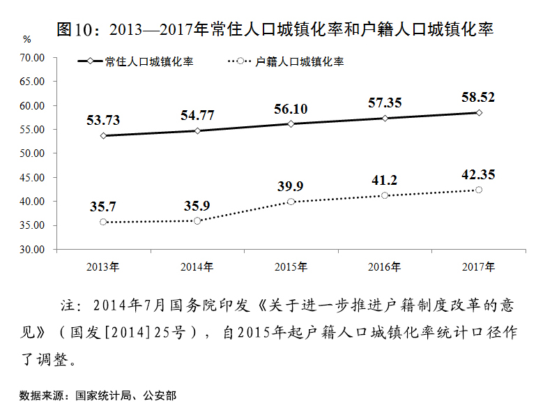 五是以人為核心的新型城鎮(zhèn)化建設(shè)扎實(shí)推進(jìn)。農(nóng)業(yè)轉(zhuǎn)移人口市民化有序推進(jìn),戶(hù)籍制度改革和居住證制度落地實(shí)施。全國(guó)常住人口城鎮(zhèn)化率達(dá)到58.52%,戶(hù)籍人口城鎮(zhèn)化率達(dá)到42.35%,均比上年增加1個(gè)百分點(diǎn)左右。城鎮(zhèn)化空間格局持續(xù)優(yōu)化,長(zhǎng)三角、長(zhǎng)江中游、成渝、哈長(zhǎng)、中原、北部灣等城市群規(guī)劃加快實(shí)施,關(guān)中平原、呼包鄂榆等跨省區(qū)城市群規(guī)劃編制完成。以市場(chǎng)化方式規(guī)范推進(jìn)特色小鎮(zhèn)和小城鎮(zhèn)建設(shè)。新型城鎮(zhèn)化綜合試點(diǎn)取得積極進(jìn)展。