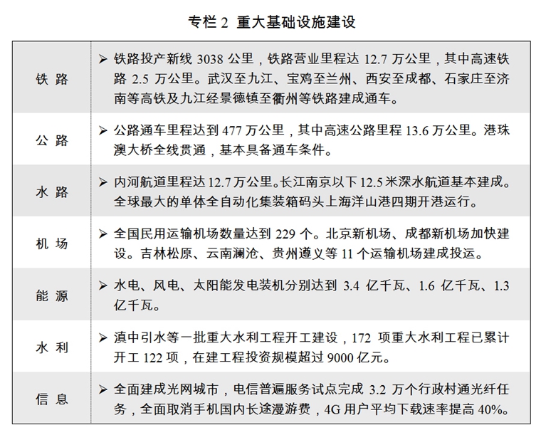 四是加強(qiáng)水利交通能源等基礎(chǔ)設(shè)施建設(shè)。今年要完成鐵路投資7320億元、公路水運(yùn)投資1.8萬(wàn)億元左右,水利在建投資規(guī)模達(dá)到1萬(wàn)億元。再開(kāi)工一批重大水利工程,加強(qiáng)中小河流治理、小型病險(xiǎn)水庫(kù)除險(xiǎn)加固等水利薄弱環(huán)節(jié)建設(shè)。加快建設(shè)北京至沈陽(yáng)、商丘經(jīng)合肥至杭州、鄭州至萬(wàn)州高鐵,開(kāi)工建設(shè)北京至雄安、和田至若羌等鐵路。有序發(fā)展高速公路,支持普通國(guó)省干線提級(jí)改造。進(jìn)一步完善通江達(dá)海、干支銜接的航道網(wǎng)絡(luò),提高干線航道通航能力和支線航道等級(jí)。積極推進(jìn)北京、成都、青島等新機(jī)場(chǎng)建設(shè),推進(jìn)一批樞紐機(jī)場(chǎng)改擴(kuò)建和支線機(jī)場(chǎng)項(xiàng)目建設(shè)。支持符合條件的城市有序發(fā)展城市軌道交通。推動(dòng)“互聯(lián)網(wǎng)+”便捷交通建設(shè),提升綜合交通服務(wù)質(zhì)量。加快構(gòu)建便捷高效、綠色安全骨干物流基礎(chǔ)設(shè)施網(wǎng)絡(luò)。落實(shí)能源生產(chǎn)和消費(fèi)革命戰(zhàn)略,推進(jìn)能源革命試點(diǎn)示范,開(kāi)展非化石能源跨越發(fā)展行動(dòng),構(gòu)建清潔能源消納長(zhǎng)效機(jī)制,加快傳統(tǒng)能源清潔高效利用,加強(qiáng)電網(wǎng)、油氣管網(wǎng)布局優(yōu)化和互聯(lián)互通,增強(qiáng)天然氣供給保障能力和油氣儲(chǔ)備應(yīng)急能力。