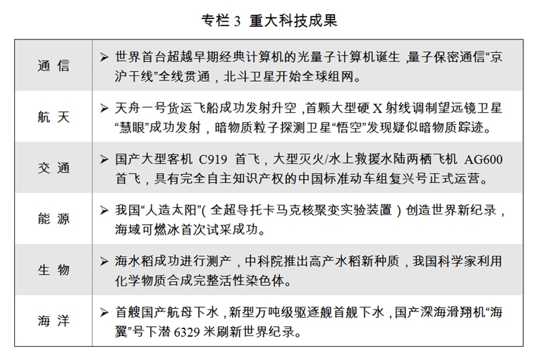 一批重大科技成果涌現(xiàn),“慧眼”衛(wèi)星成功發(fā)射運(yùn)行,C919大型客機(jī)首飛,量子計(jì)算機(jī)研制取得重大突破,首艘國(guó)產(chǎn)航母順利下水,海域可燃冰首次試采成功。全面創(chuàng)新改革試驗(yàn)深入推進(jìn),169項(xiàng)先行先試改革舉措全面啟動(dòng),其中13項(xiàng)改革舉措向全國(guó)推廣。北京、上??萍紕?chuàng)新中心,北京懷柔、上海張江、安徽合肥三個(gè)綜合性國(guó)家科學(xué)中心加快建設(shè)。國(guó)家實(shí)驗(yàn)室建設(shè)啟動(dòng),國(guó)家重大科技基礎(chǔ)設(shè)施建設(shè)持續(xù)推進(jìn)。國(guó)家科技重大專(zhuān)項(xiàng)加速攻堅(jiān),“科技創(chuàng)新2030-重大項(xiàng)目”啟動(dòng)實(shí)施。研發(fā)費(fèi)用加計(jì)扣除、股權(quán)激勵(lì)和技術(shù)入股所得稅優(yōu)惠政策、完善高新技術(shù)企業(yè)認(rèn)定辦法等進(jìn)一步落實(shí),17家國(guó)家自主創(chuàng)新示范區(qū)、156家國(guó)家高新區(qū)形成區(qū)域創(chuàng)新發(fā)展的核心載體和重要引擎。