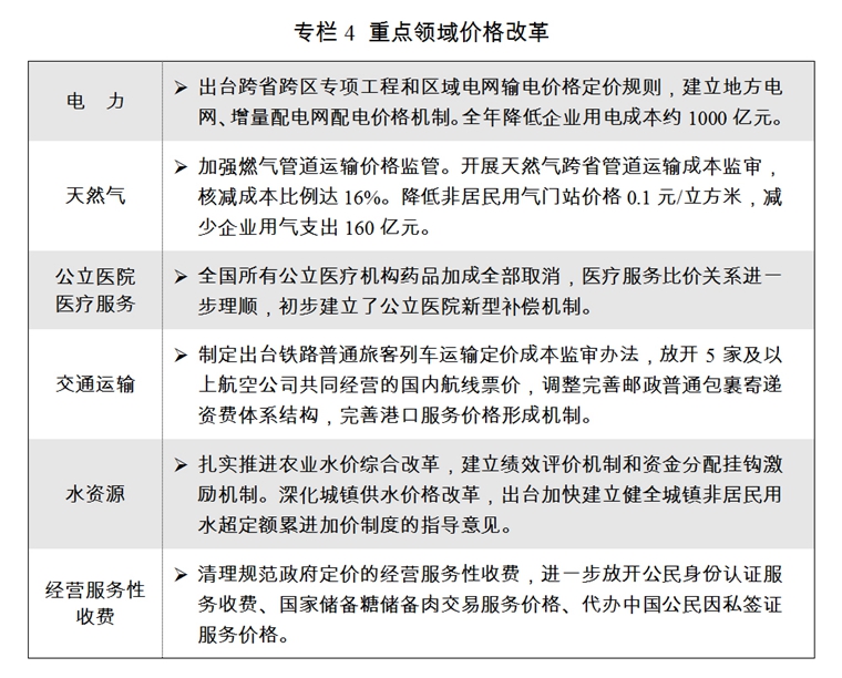 五是價(jià)格改革繼續(xù)深化。全面深化價(jià)格機(jī)制改革的意見(jiàn)出臺(tái)實(shí)施。持續(xù)推進(jìn)能源領(lǐng)域價(jià)格改革,完成首輪省級(jí)電網(wǎng)輸配電價(jià)改革,降低非居民用氣基準(zhǔn)門(mén)站價(jià)格,天然氣全產(chǎn)業(yè)鏈價(jià)格監(jiān)管制度基本建立。公立醫(yī)院藥品加成全部取消,公立醫(yī)療機(jī)構(gòu)特需等醫(yī)療服務(wù)定價(jià)穩(wěn)步放開(kāi)。交通運(yùn)輸價(jià)格改革加快推進(jìn)。水資源價(jià)格改革穩(wěn)步推進(jìn)。