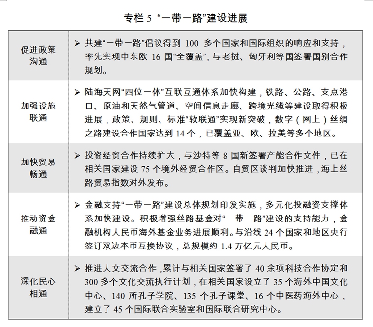 一是“一帶一路”建設(shè)有力有序有效推進(jìn)。首屆“一帶一路”國(guó)際合作高峰論壇成功舉辦。已與86個(gè)國(guó)家和國(guó)際組織簽署“一帶一路”合作文件101份。中歐班列累計(jì)開(kāi)行6637列,其中2017年開(kāi)行3673列。蒙內(nèi)鐵路建成投運(yùn),匈塞鐵路、中老鐵路、中泰鐵路開(kāi)工建設(shè),雅萬(wàn)高鐵建設(shè)積極推進(jìn)。中俄原油管道復(fù)線工程建成。中白工業(yè)園、中泰羅勇工業(yè)園等境外園區(qū)穩(wěn)步發(fā)展。