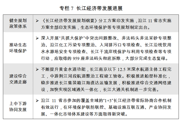 三是長(zhǎng)江經(jīng)濟(jì)帶發(fā)展取得積極進(jìn)展。全面落實(shí)《長(zhǎng)江經(jīng)濟(jì)帶發(fā)展規(guī)劃綱要》,省際合作協(xié)商機(jī)制有效運(yùn)行,“共抓大保護(hù)”格局初步形成。非法碼頭非法采砂整治、飲用水水源地安全檢查等專(zhuān)項(xiàng)行動(dòng)深入開(kāi)展,負(fù)面清單、跨界斷面考核等生態(tài)環(huán)保制度建設(shè)加快推進(jìn),水環(huán)境治理、水生態(tài)修復(fù)和水資源保護(hù)等重大工程大力實(shí)施。綜合立體交通走廊加快建設(shè),上海、武漢、重慶三大航運(yùn)中心建設(shè)進(jìn)展順利,滬蓉、滬渝、滬昆高速公路全線通車(chē)。