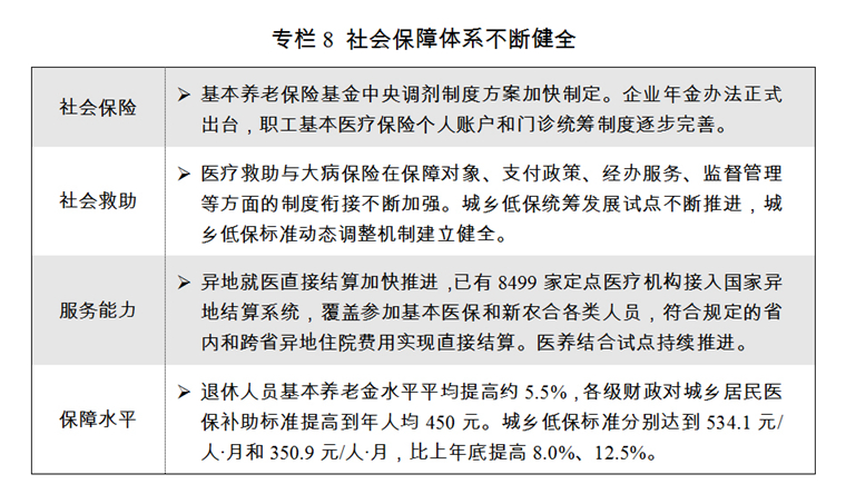 二是社會(huì)保障體系不斷健全。養(yǎng)老保險(xiǎn)制度頂層設(shè)計(jì)取得關(guān)鍵性進(jìn)展,劃轉(zhuǎn)部分國(guó)有資本充實(shí)社?;饘?shí)施方案印發(fā)實(shí)施。城鄉(xiāng)居民基本醫(yī)療保險(xiǎn)制度整合深入推進(jìn),異地就醫(yī)直接結(jié)算取得重要突破,所有省級(jí)異地就醫(yī)結(jié)算系統(tǒng)、所有統(tǒng)籌地區(qū)均與國(guó)家異地就醫(yī)結(jié)算系統(tǒng)實(shí)現(xiàn)對(duì)接。高齡津貼制度已在全國(guó)31個(gè)省份和新疆生產(chǎn)建設(shè)兵團(tuán)實(shí)現(xiàn)全覆蓋。城鎮(zhèn)職工基本養(yǎng)老和城鄉(xiāng)居民養(yǎng)老保險(xiǎn)參保人數(shù)分別達(dá)到4.02億人和5.13億人。城鎮(zhèn)棚戶(hù)區(qū)住房改造開(kāi)工609萬(wàn)套。