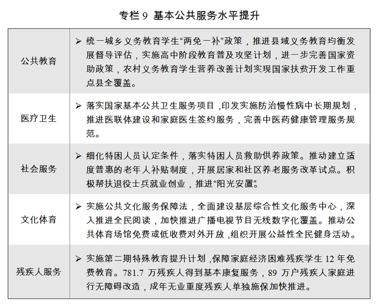 三是基本公共服務(wù)體系進(jìn)一步完善?!笆濉蓖七M(jìn)基本公共服務(wù)均等化規(guī)劃出臺(tái),國(guó)家基本公共服務(wù)清單制度開(kāi)始建立。九年義務(wù)教育鞏固率93.8%,高中階段教育毛入學(xué)率88.3%,財(cái)政性教育經(jīng)費(fèi)支出占國(guó)內(nèi)生產(chǎn)總值比例繼續(xù)超過(guò)4%。全部三級(jí)公立醫(yī)院參加醫(yī)聯(lián)體建設(shè),每千人口醫(yī)療衛(wèi)生機(jī)構(gòu)床位數(shù)達(dá)到5.66張。公共文化服務(wù)保障法正式實(shí)施,以縣為單位加快落實(shí)國(guó)家基本公共文化服務(wù)指導(dǎo)標(biāo)準(zhǔn)和省級(jí)實(shí)施標(biāo)準(zhǔn)。全民健身指南發(fā)布,“十三五”國(guó)家老齡事業(yè)發(fā)展和養(yǎng)老體系建設(shè)規(guī)劃印發(fā)實(shí)施。加強(qiáng)社會(huì)兜底保障,困難殘疾人生活補(bǔ)貼和重度殘疾人護(hù)理補(bǔ)貼受益人數(shù)均超過(guò)1000萬(wàn),近6000萬(wàn)低保人員和特殊困難群眾基本生活得到有效保障,農(nóng)村留守兒童關(guān)愛(ài)保護(hù)體系全面構(gòu)建,近50萬(wàn)孤兒和艾滋病毒感染兒童納入政府保障。全面兩孩政策持續(xù)推進(jìn),全年出生人口1723萬(wàn)人,年末總?cè)丝?3.9億人,人口自然增長(zhǎng)率為5.32‰。