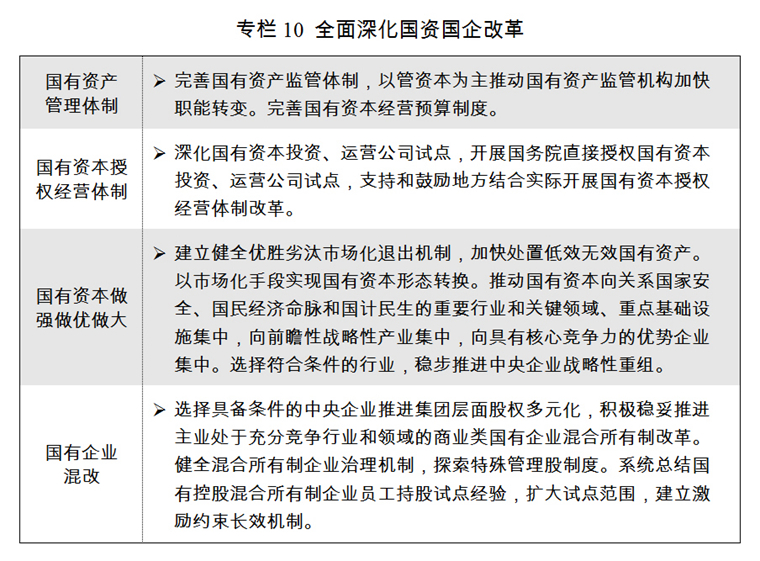 五是深化國(guó)資國(guó)企改革。完善各類(lèi)國(guó)有資產(chǎn)管理體制,以管資本為主加快轉(zhuǎn)變國(guó)有資產(chǎn)監(jiān)管機(jī)構(gòu)職能,改革國(guó)有資本授權(quán)經(jīng)營(yíng)體制。加快國(guó)有經(jīng)濟(jì)布局優(yōu)化、結(jié)構(gòu)調(diào)整、戰(zhàn)略性重組,以資本為紐帶促進(jìn)各類(lèi)所有制企業(yè)優(yōu)勢(shì)互補(bǔ),推動(dòng)國(guó)有資本做強(qiáng)做優(yōu)做大。積極穩(wěn)妥推進(jìn)國(guó)有企業(yè)股權(quán)多元化和混合所有制改革,進(jìn)一步推動(dòng)重點(diǎn)領(lǐng)域混合所有制改革試點(diǎn),培育具有全球競(jìng)爭(zhēng)力的世界一流企業(yè)。深化國(guó)有林區(qū)林場(chǎng)、農(nóng)墾改革。