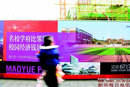 ▲1月16日,重慶渝北中央公園,一位市民抱著孩子從寫(xiě)有“名校學(xué)府”字樣的房地產(chǎn)廣告前走過(guò)。在重慶,許多樓盤(pán)將中小學(xué)名校作為賣(mài)點(diǎn)進(jìn)行宣傳營(yíng)銷(xiāo)。記者王全超攝