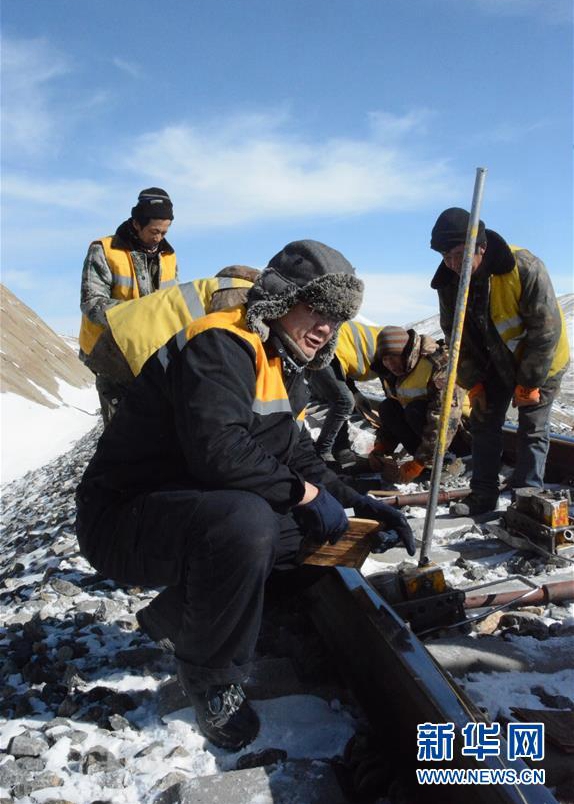 青藏鐵路格爾木工務段望昆線路養(yǎng)護車間副主任于本蕃(右)和工友一起檢查軌道平順度(1月11日攝)。 新華社發(fā)(王浡 攝)