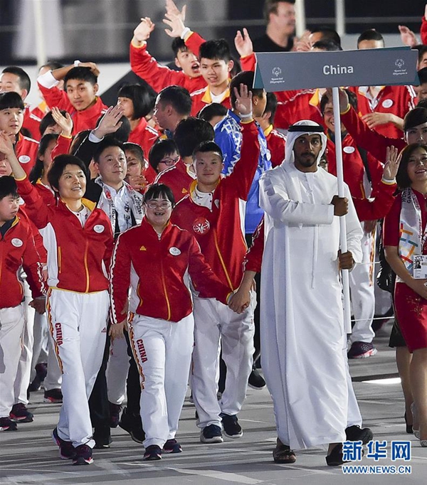 圖為3月14日,李想(中)與自己的偶像、前奧運(yùn)冠軍李小鵬(前排右五)隨中國代表團(tuán)在2019年阿布扎比夏季特奧會(huì)開幕式上入場(chǎng)。 新華社記者 夏一方 攝