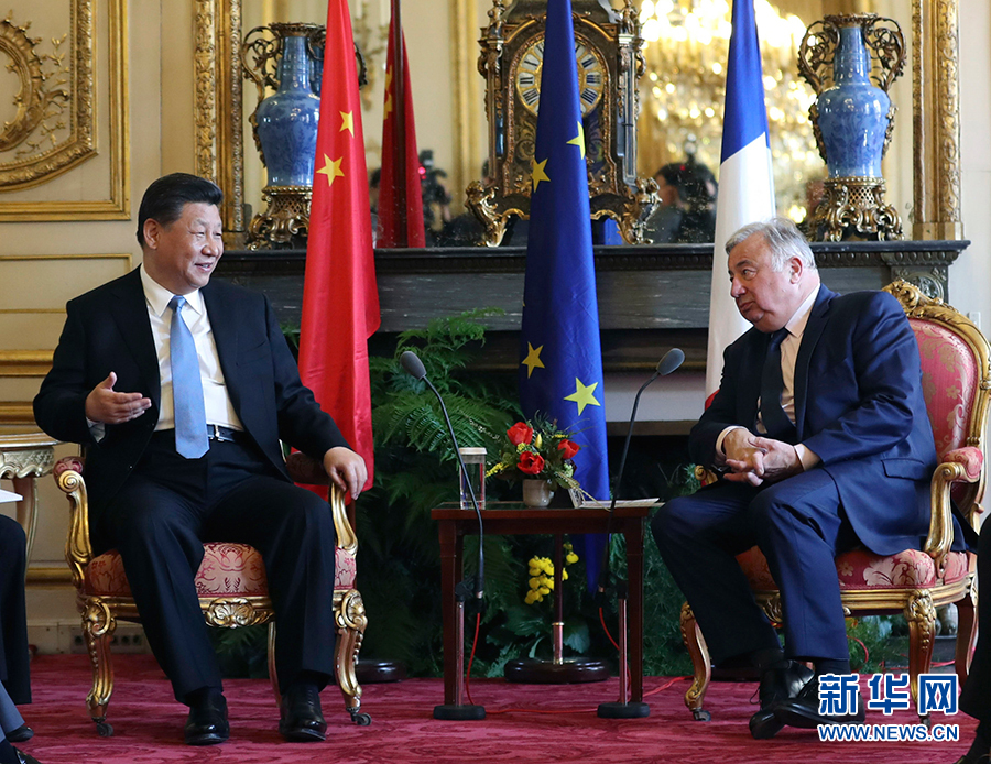 3月26日,國(guó)家主席習(xí)近平在巴黎會(huì)見(jiàn)法國(guó)參議長(zhǎng)拉爾歇。 新華社記者丁海濤攝