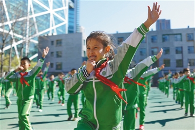 新京報(bào)記者走訪北京中小學(xué)發(fā)現(xiàn),動(dòng)感活潑的音樂和流行的動(dòng)作更能激發(fā)同學(xué)的鍛煉熱情,尤其是那些跳慣了傳統(tǒng)廣播體操的高年級(jí)學(xué)生。為此,北京一些學(xué)校通過自編操提升學(xué)生興趣,武術(shù)、跳繩等動(dòng)作和流行音樂也融入了課間操中。