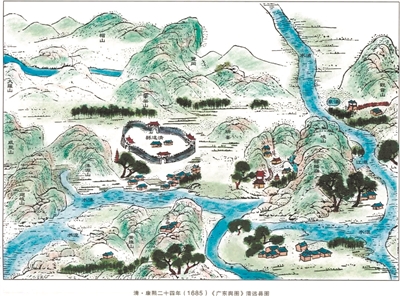 清代康熙年間的清遠地圖, 用中國山水畫中的散點透視的技法繪制。