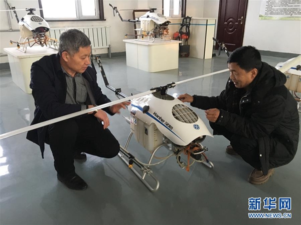 孫斌(左)在公司與同事一起保養(yǎng)無人機(2月2日攝)。新華社記者 王君寶 攝