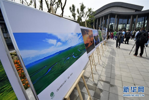 在北京世園會“內(nèi)蒙古日”文化展示活動上展出的呼倫貝爾風光攝影作品(5月17日攝)。新華社記者 李欣 攝