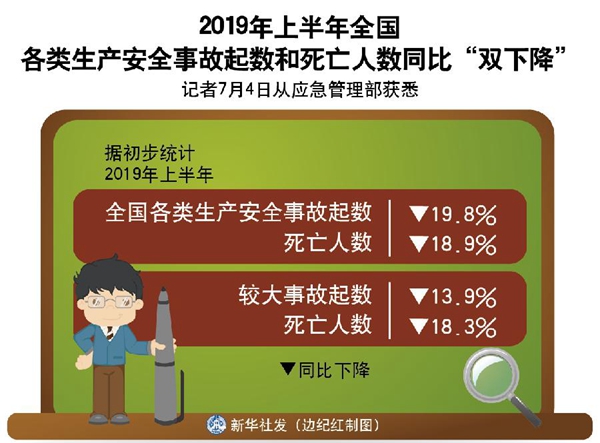 新華社北京7月4日電(記者魏玉坤、葉昊鳴)記者4日從應(yīng)急管理部獲悉,據(jù)初步統(tǒng)計(jì),今年上半年,全國各類生產(chǎn)安全事故起數(shù)和死亡人數(shù)同比分別下降19.8%和18.9%,較大事故起數(shù)和死亡人數(shù)同比分別下降13.9%和18.3%。
