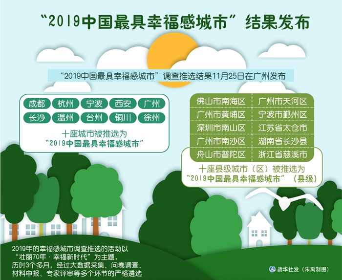 新華社廣州11月26日電(記者荊淮僑、鄧華)“2019中國最具幸福感城市”調(diào)查推選結(jié)果25日在廣州發(fā)布,成都等10個地級(以上)城市、佛山市南海區(qū)等10個縣級城市(區(qū))當(dāng)選。