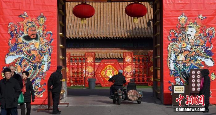 資料圖:農(nóng)歷除夕當天,北京地壇公園入口被大幅門神和大紅燈籠等裝飾一新。中新社記者 侯宇 攝