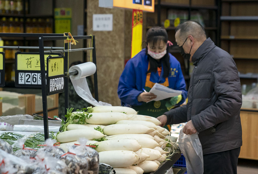 1月29日,市民在青島市一家大型超市內(nèi)采購蔬菜。新華社記者李紫恒攝