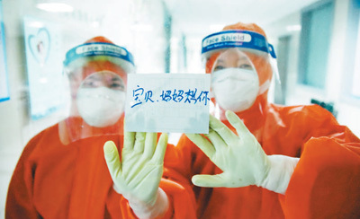 在湖北省十堰市鄖陽區(qū)人民醫(yī)院感染科,28歲的護士焦嬌堅守在隔離病區(qū),偶爾才能與3歲的女兒視頻通話。圖為焦嬌(左)與同事將寫有“寶貝,媽媽想你”的紙條貼在玻璃上。周家山攝(人民視覺)