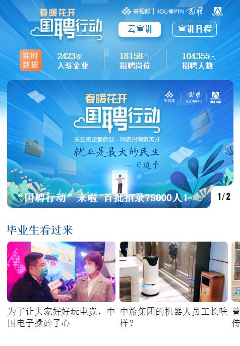 “國(guó)聘行動(dòng)”上線以來,已成功舉辦了18場(chǎng)網(wǎng)絡(luò)“云宣講”,累計(jì)求職頁(yè)面瀏覽量突破1000萬,投遞簡(jiǎn)歷30多萬份。十大軍工企業(yè)、三大航空公司、三大電信運(yùn)營(yíng)商、各大電力企業(yè)等中央企業(yè)紛紛匯聚,萬科、騰訊、京東、阿里、拼多多等知名民企紛紛參與,企業(yè)負(fù)責(zé)人在線答疑,釋放了大量就業(yè)崗位。