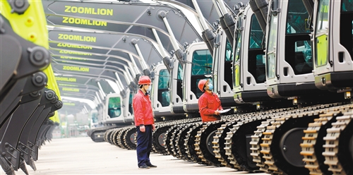 位于陜西省渭南高新區(qū)的中聯(lián)重科渭南工業(yè)園內(nèi),檢驗(yàn)人員對(duì)即將出廠的挖掘機(jī)檢查驗(yàn)收。崔正博攝(中經(jīng)視覺)