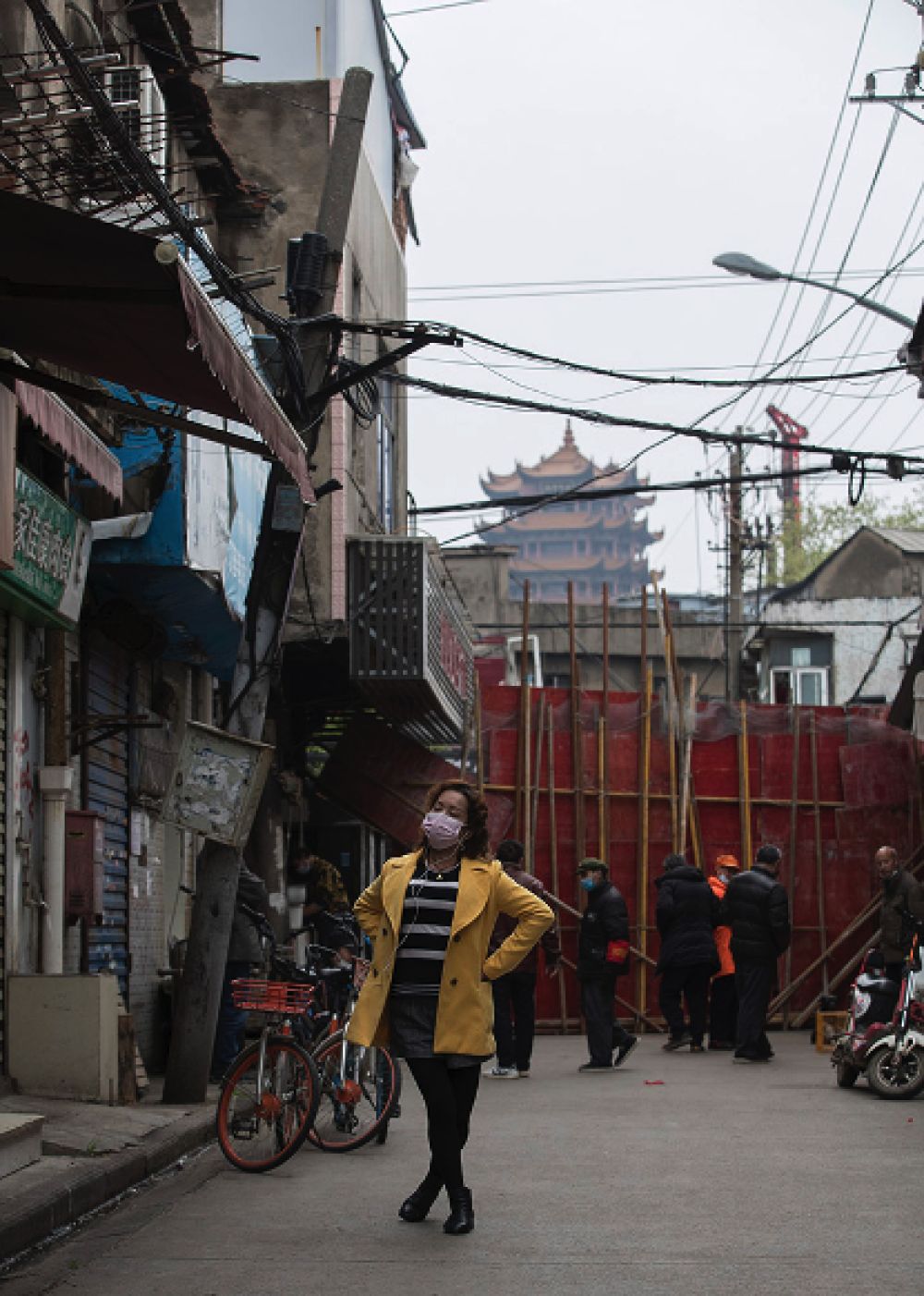 ↑4月2日,在武漢黃鶴樓附近的武漢西城壕社區(qū),一位女士在練習模特步。