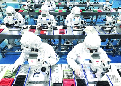 江蘇連云港海州經(jīng)濟開發(fā)區(qū)內一公司,工人正在加緊生產(chǎn)一批海外企業(yè)配套的手機攝像頭產(chǎn)品。耿玉和攝/光明圖片