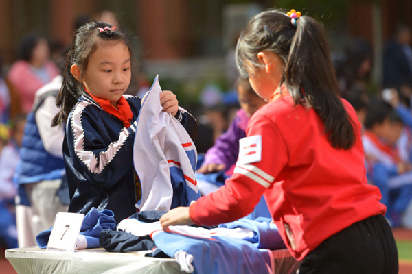 小學(xué)學(xué)生在進行疊衣服比賽 劉東岳 攝