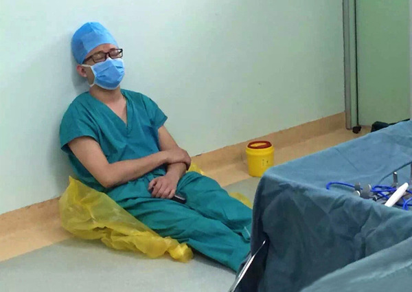 在幾臺手術(shù)的間隙,于鐵夫睡倒在手術(shù)室里(資料照片)。新華社發(fā)