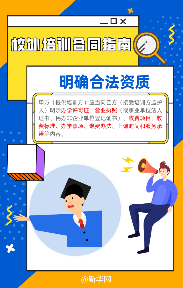 長(zhǎng)期以來(lái),校外培訓(xùn)機(jī)構(gòu)的資質(zhì)問(wèn)題,以及部分培訓(xùn)機(jī)構(gòu)存在違規(guī)收費(fèi)、退費(fèi)難、卷款“跑路”現(xiàn)象,這些令學(xué)生和家長(zhǎng)發(fā)愁。教育部、市場(chǎng)監(jiān)管總局近日發(fā)布《中小學(xué)生校外培訓(xùn)服務(wù)合同(示范文本)》,供培訓(xùn)者(學(xué)員)監(jiān)護(hù)人與開(kāi)展中小學(xué)生校外培訓(xùn)的培訓(xùn)機(jī)構(gòu)簽訂培訓(xùn)合同時(shí)參照使用,為規(guī)范校外培訓(xùn)做出新的探索。一起來(lái)看看,這份“國(guó)家版”標(biāo)準(zhǔn)合同有哪些亮點(diǎn)?