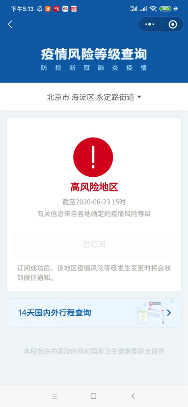 北京又增一個高風險地區(qū)! 記者從國務院客戶端小程序“疫情風險等級查詢”上了解到,截至6月23日15時,北京市海淀區(qū)永定路街道由中風險調(diào)整為高風險。