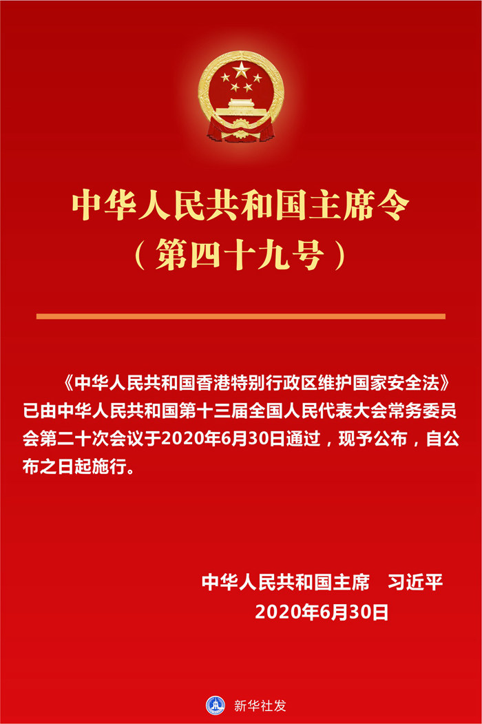 《中華人民共和國香港特別行政區(qū)維護(hù)國家安全法》已由中華人民共和國第十三屆全國人民代表大會(huì)常務(wù)委員會(huì)第二十次會(huì)議于2020年6月30日通過,現(xiàn)予公布,自公布之日起施行。