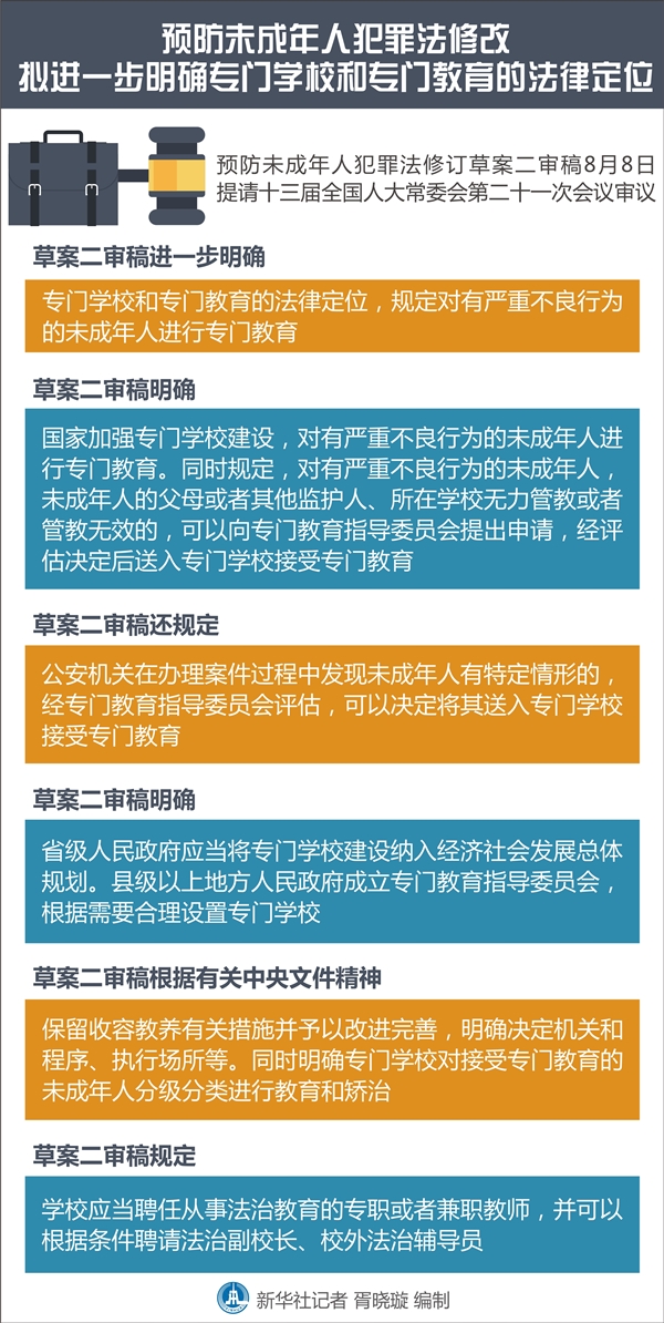 新華社北京8月8日電(記者熊豐)預(yù)防未成年人犯罪法修訂草案二審稿8日提請(qǐng)十三屆全國(guó)人大常委會(huì)第二十一次會(huì)議審議。草案二審稿進(jìn)一步明確專門學(xué)校和專門教育的法律定位,規(guī)定對(duì)有嚴(yán)重不良行為的未成年人進(jìn)行專門教育。