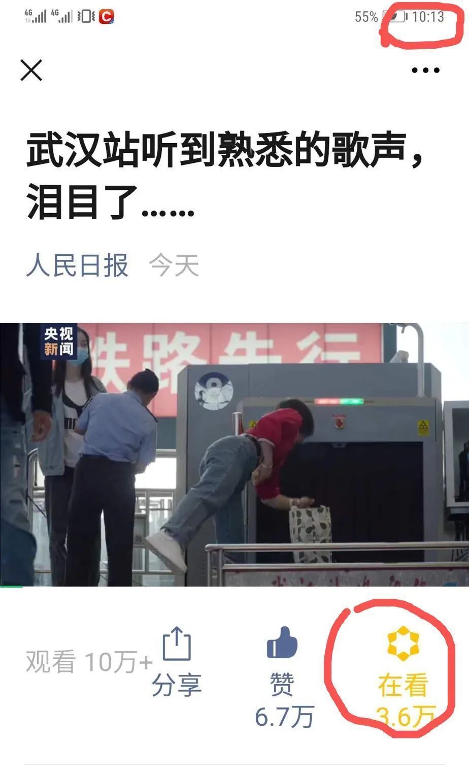 首先是央視的重磅炸彈,簡直一個接一個:早起就被一條《當武漢火車站響起熟悉的歌聲……》的快閃新聞震得瞬間淚奔。單是那前奏一起,看到如今擠擠挨挨的武漢火車站現(xiàn)場、交織著那曾經(jīng)至暗時刻的回憶,心疼、感動、自豪……種種情愫油然而生!當張定宇出現(xiàn)在鏡頭里,畫面定格在“這是英雄的祖國”,那一刻,心真的是知道了什么叫“DUANG”一下!快閃之后,現(xiàn)場群眾最多說到的“不容易”和“安全感”,真是大家的心聲。也正是因為如此,人民日報微信公號16:36轉發(fā)這條視頻后,晚上10點剛過,在看量就已經(jīng)達到3.6萬——人心所向,可見一斑。