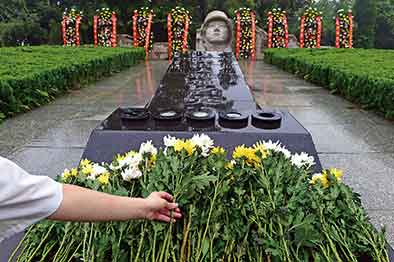 在臺(tái)兒莊無名烈士墓前,一位青年獻(xiàn)花(8月15日攝)。新華社記者郭緒雷攝