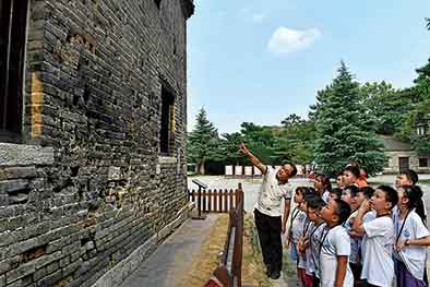 在臺(tái)兒莊大戰(zhàn)遺址公園彈孔墻前,作家時(shí)培京(左一)給孩子講述歷史(8月19日攝)。新華社記者郭緒雷攝