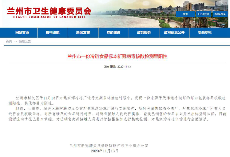 蘭州市城關(guān)區(qū)于11月13日對焦家灣冷凍廠進行定期采樣抽檢過程中,發(fā)現(xiàn)一份來源于天津港冷鏈蝦的蝦內(nèi)包裝樣品核酸檢測陽性,其他樣品為陰性。
