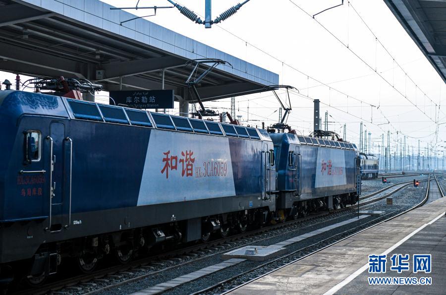 12月9日,在新疆庫爾勒站,32812次貨運列車準(zhǔn)備發(fā)車。新華社記者 王菲 攝