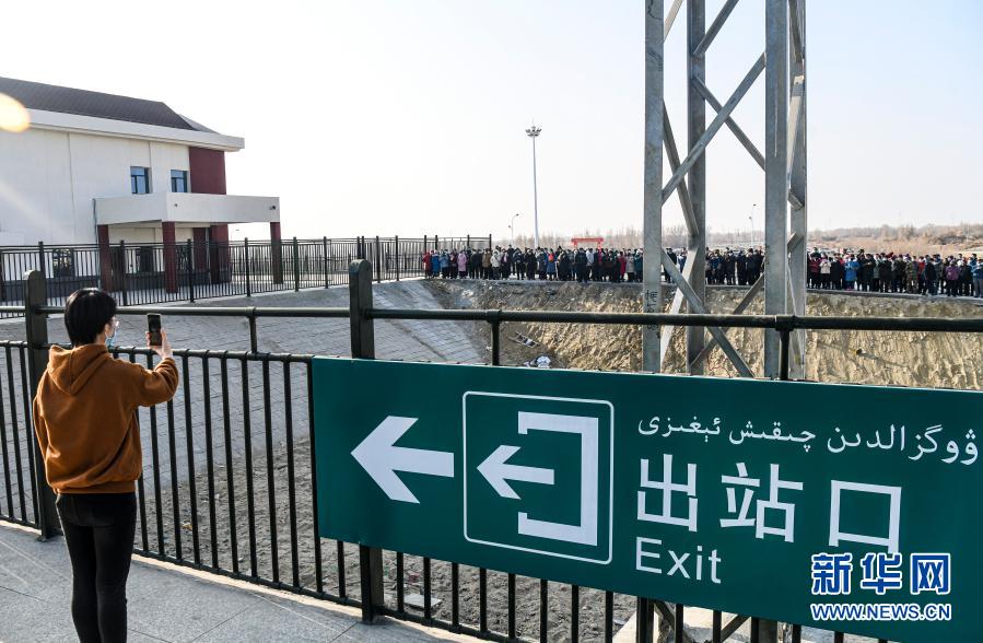 12月9日,在位于新疆尉犁縣境內(nèi)的庫爾木依站,當(dāng)?shù)鼐用褡园l(fā)地來到車站外圍觀列車。新華社記者 王菲 攝