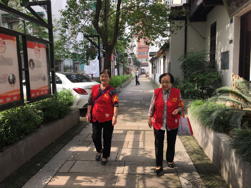 “紅巷老舅媽”志愿者在社區(qū)巡邏。(小營(yíng)巷社區(qū)供圖)